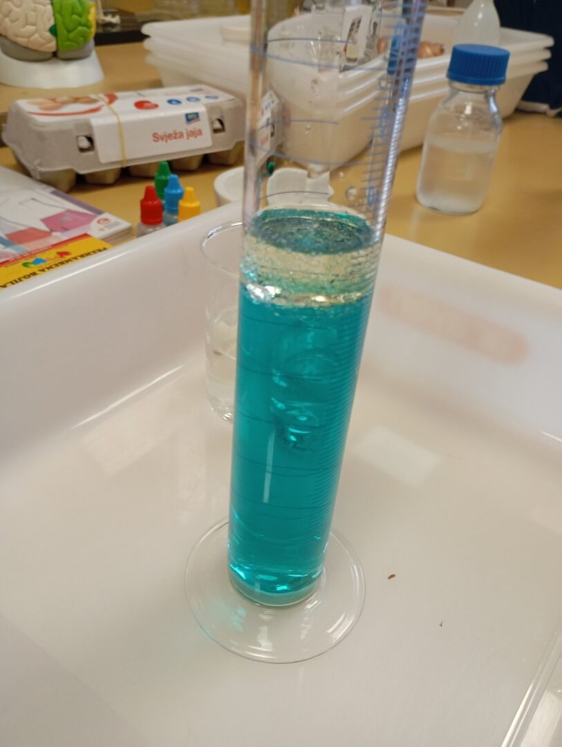 U našoj školi nastavljamo s provedbom projekta „Pametni laboratorij – STEM integracija za budućnost“, koji se provodi u sklopu projekta i programa rada s darovitim učenicima i financira ga Ministarstvo znanosti i obrazovanja Republike Hrvatske. U okviru projektnih aktivnosti učenici sedmog i osmog razreda pod mentorstvom voditeljice projekta, učiteljice Monike Pavić sudjelovali su u radionici „Lava lampa – Gustoća i reakcija“. Na satu su izrađivali vlastitu lava lampu koristeći vodu, ulje, boju i šumeću tabletu. Kada su dodali tabletu, u čaši su se počeli stvarati mjehurići, a obojene kapljice su se podizale i spuštale poput prave lava lampe. Oduševljenja nije nedostajalo!