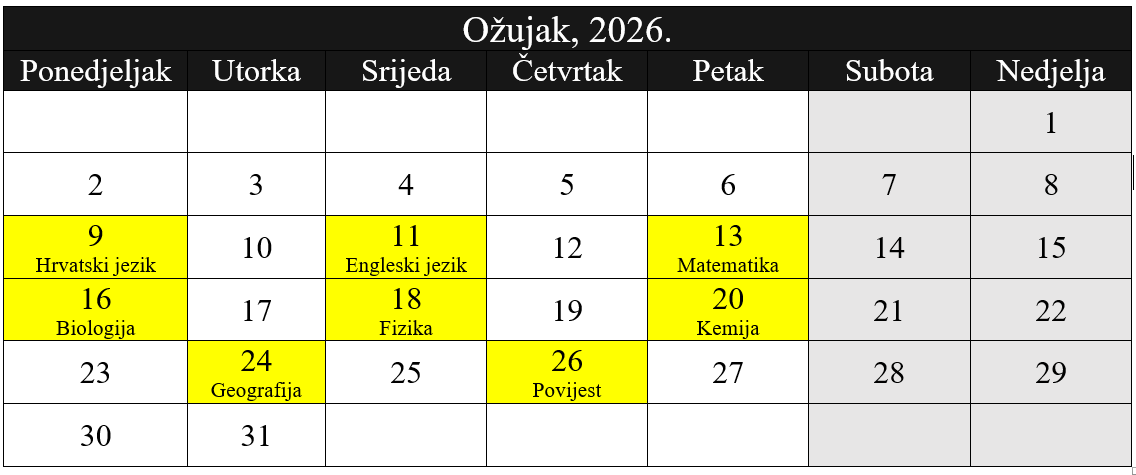 U ostale dane provedbe nacionalnih ispita (žuto označenim na kalendaru, osim 9.3.) nastava počinje: