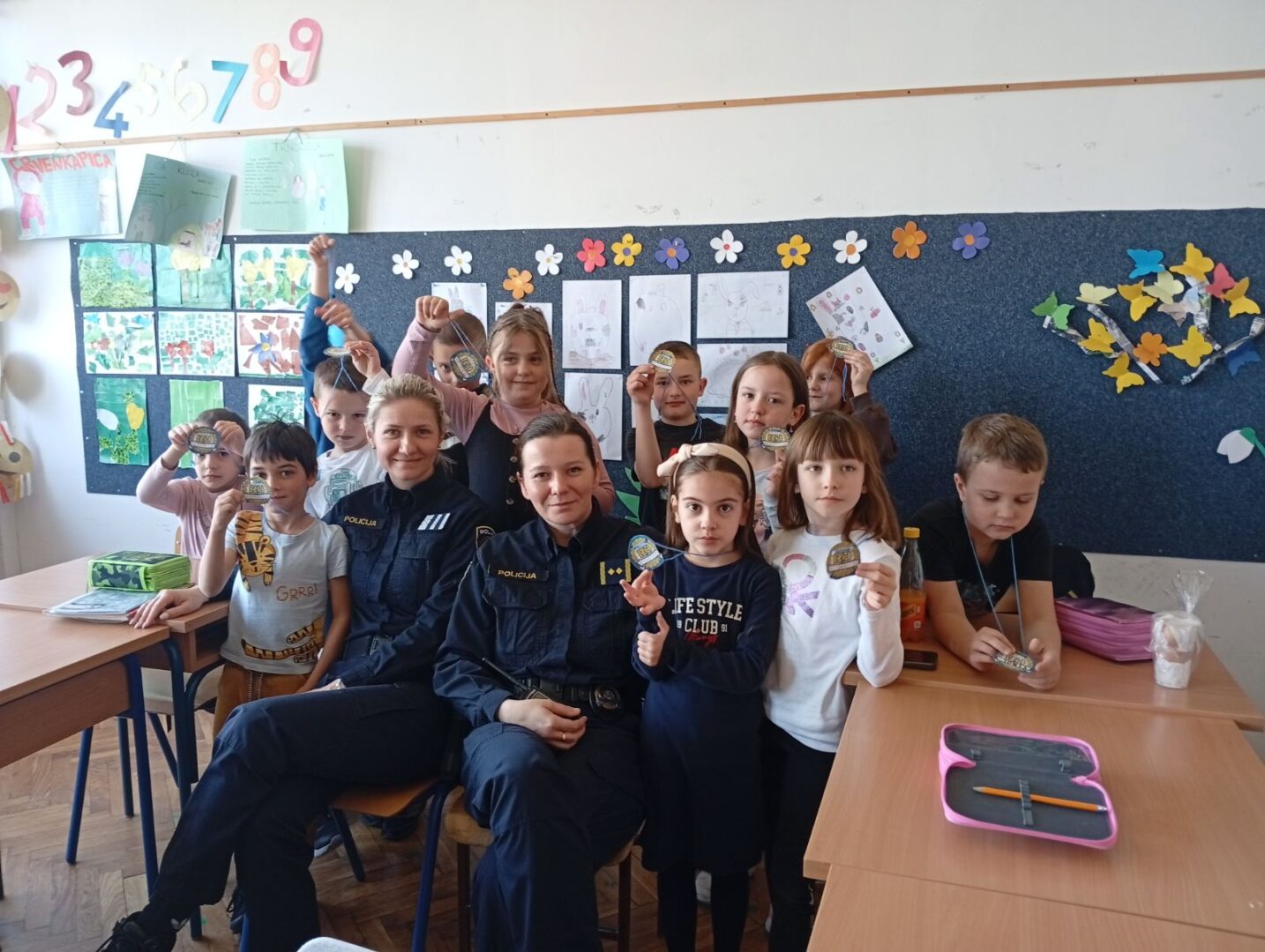 Policajke su učenicima pokazale dio policijske opreme koju nose sa sobom, poput značke i lisica, što je izazvalo veliko zanimanje i mnoštvo pitanja. Učenici su s velikim zanimanjem sudjelovali u razgovoru te su na kraju radionice izradili i svoje policijske značke, čime su pokazali koliko su uživali u ovom poučnom susretu. Ovaj posjet bio je lijepa prilika da učenici na zanimljiv način nauče više o važnoj ulozi policije u našoj zajednici te potraže pomoć kada je to potrebno. Veselimo se novoj suradnji.