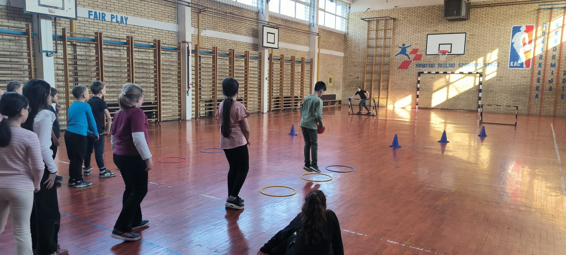 U školskoj dvorani učenici 2. razreda sudjelovali su u radionici poticanja kretanja koju je vodila školska knjižničarka i nastavnik tjelesnog. Na početku radionice razgovarali su o važnosti kretanja i tjelesne aktivnosti za zdravlje, nakon čega su se zagrijali i razgibali kroz nekoliko jednostavnih vježbi. Nakon uvodnog dijela učenici su podijeljeni u dva tima. Njihov zadatak bio je proći poligon koji se sastojao od različitih prepreka koje je trebalo savladati spretnim kretanjem. Kako bi aktivnost bila još zanimljivija, učenici su se natjecali – cilj je bio što točnije i brže proći poligon. Uz puno smijeha, navijanja i timskog duha učenici su uspješno svladali sve prepreke te pokazali koliko kretanje može biti zabavno i važno za zdravlje. Radionica je održana u sklopu projekta „Mali koraci za veliko zdravlje“, koji sufinancira Ministarstvo znanosti, obrazovanja i mladih.